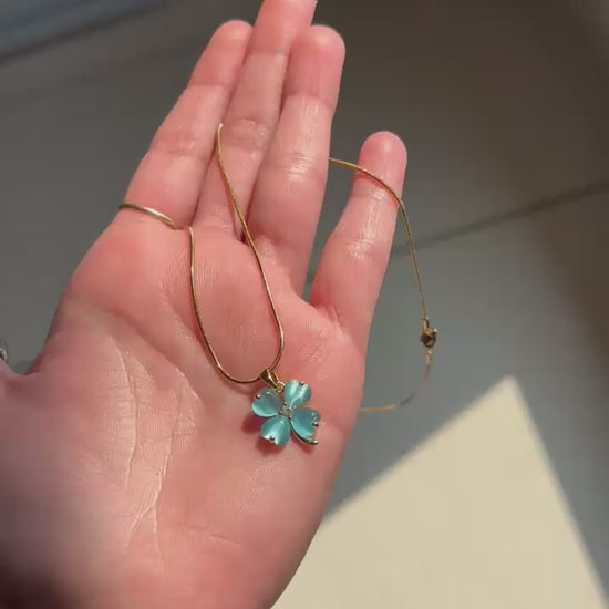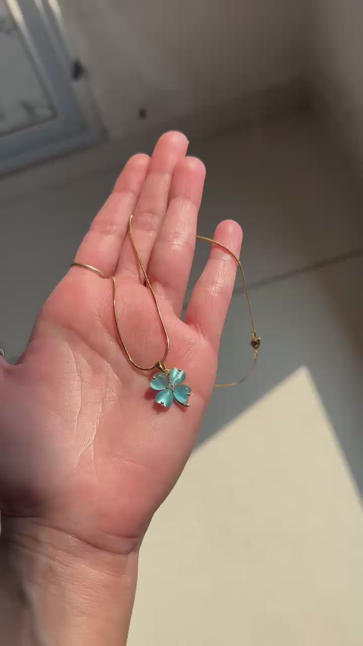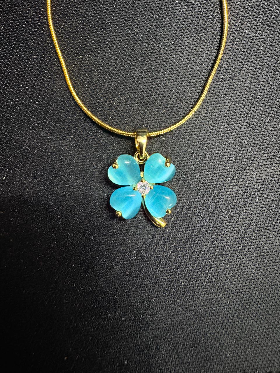 Aurelia Clover Pendant features a radiant clover design crafted with serene aqua-toned stones, accented by a delicate crystal center and finished in a rich gold tone. Symbolizing luck and elegance, this refined pendant adds fresh charm, graceful sparkle, and timeless sophistication to everyday wear and special occasions.