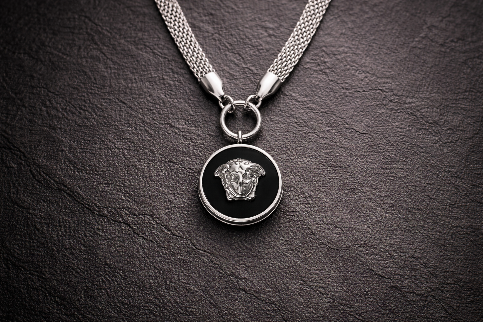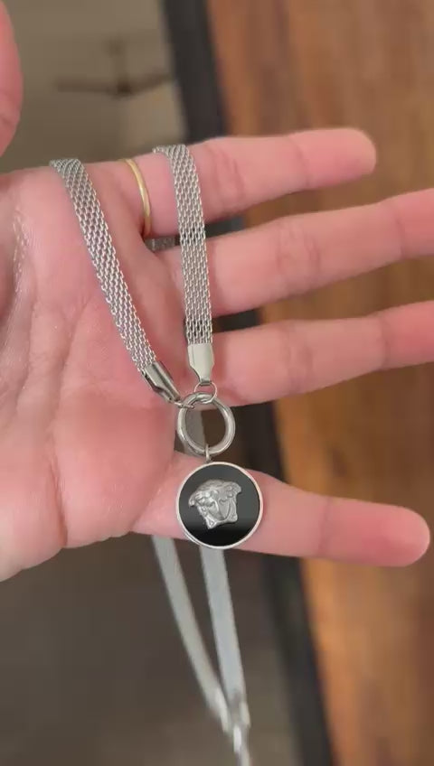 Midnight Medusa Neck Chain features a striking Medusa emblem set against a deep black enamel finish, paired with a rugged silver chain. Designed for fearless style, this statement necklace blends mythological power, masculine elegance, and modern luxury—perfect for streetwear and bold everyday fashion.
